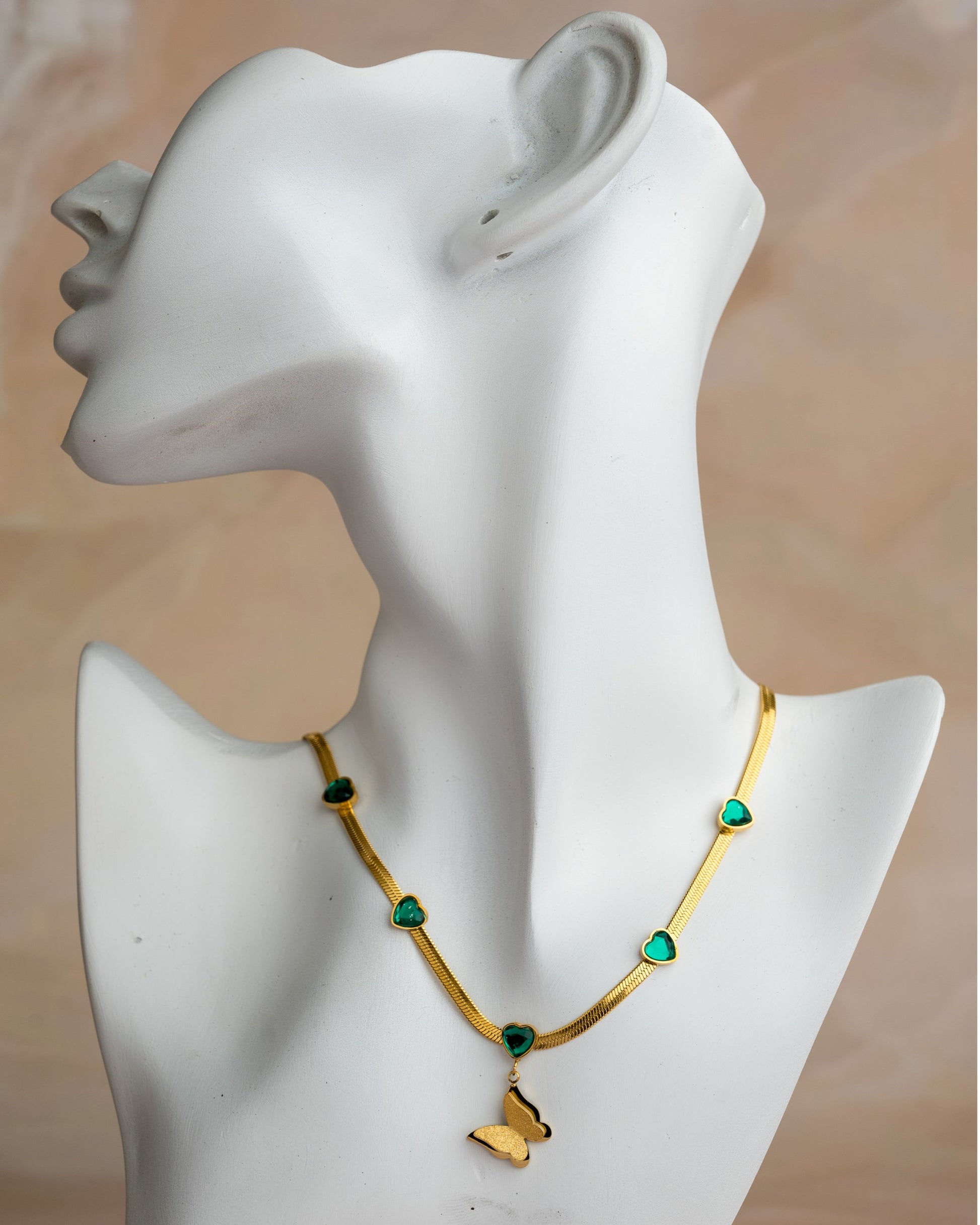 Thick Gold Chain With Green Stone & Gold Butterfly