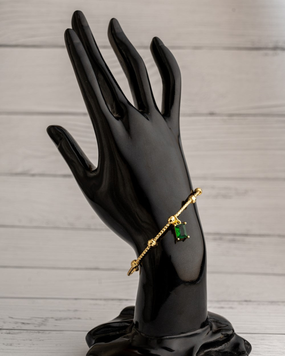 Delicate gold open bangle with rectangular green stone hanging
