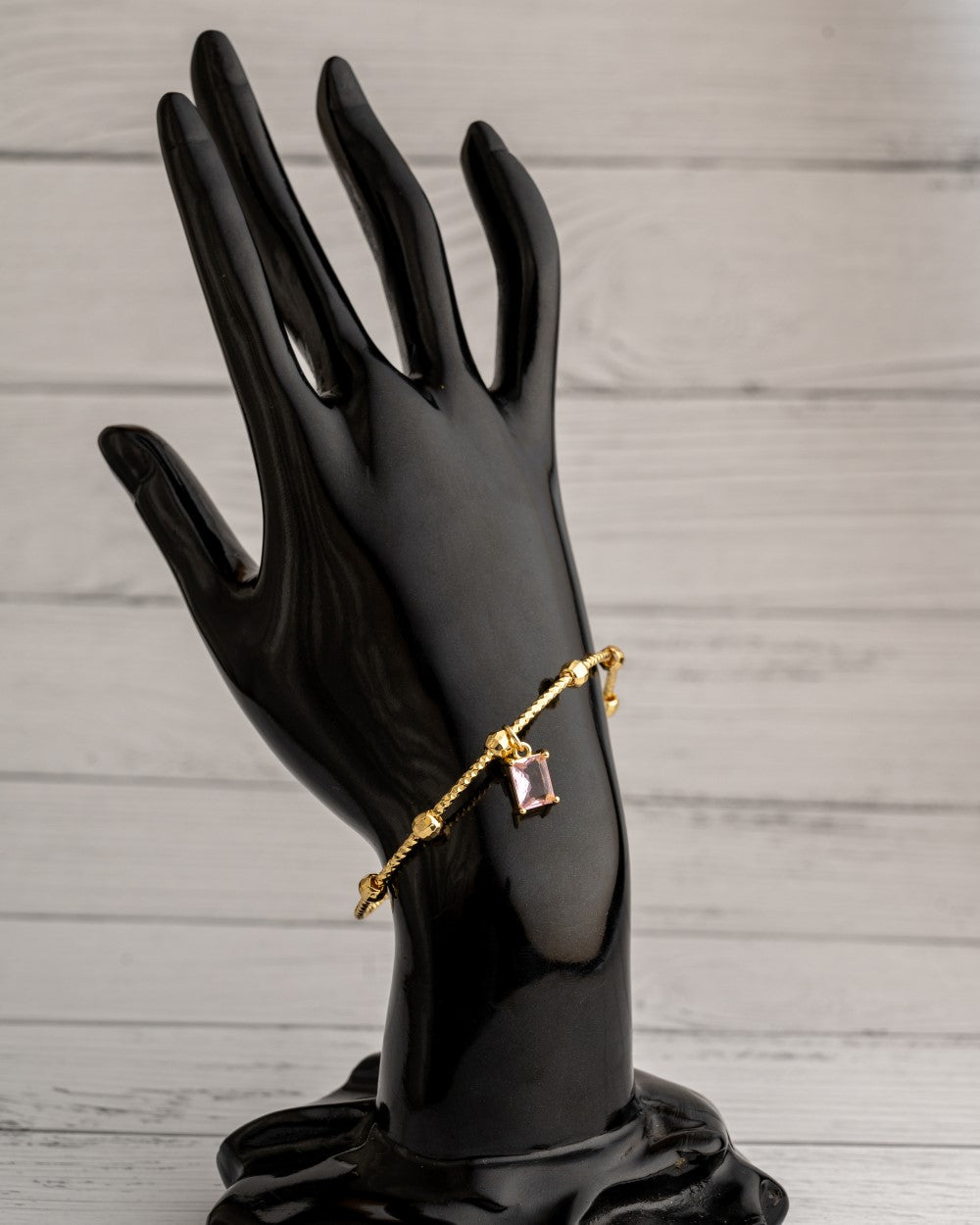 Delicate gold open bangle with rectangular light pink stone hanging