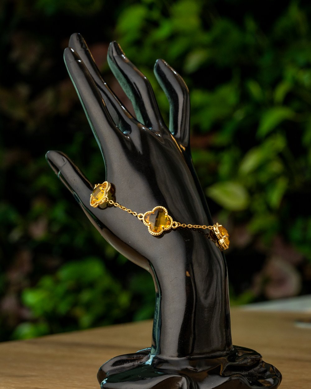 Big yellow clover stone with gold border on stone & gold chain bracelet